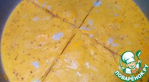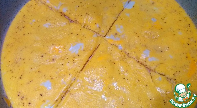 Яйца взбиваем с добавлением соли и перца, готовим "омлет" на сухой сковороде.