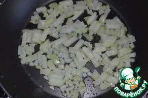 Пока закипает вода, нарезать лук мелким кубиком и отправить на разогретую с растительным маслом сковороду.