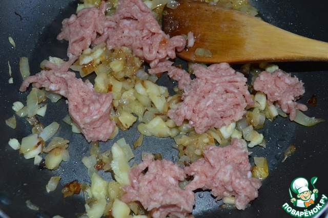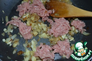 Добавить измельченную мякоть кабачка к луку, обжарить 5 мин. и добавить фарш. Жарить еще 5 мин., затем влить соевый соус, добавить измельченный чеснок и молотый перец. Если нужно подсолить. Обжарить еще 2 мин. и снять с огня.