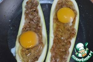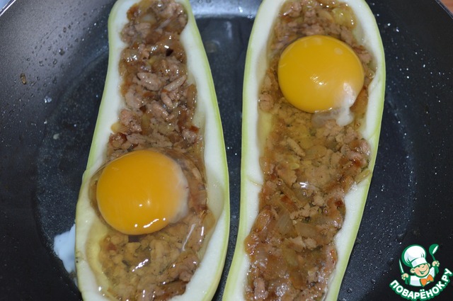 Кабачковые лодочки посолить, наполнить наполовину фаршем. В сковороду налить бульон, выложить фаршированные кабачки, в каждую половинку аккуратно разбить по одному яйцу, посолить. Накрыть крышкой и поставить на огонь.