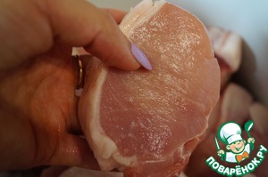 Свиной карбонад нарезать пластинами толщиной 2 см.