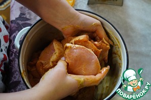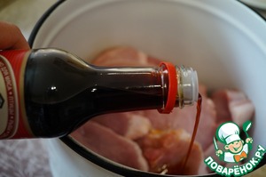 К мясу добавить соевый соус Терияки (маринад от ТМ Киккоман), перемешать и оставить минут на 10. Регулируйте количество соуса по своему вкусу, я соль не добавляю, мне хватает соуса.