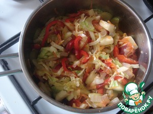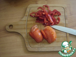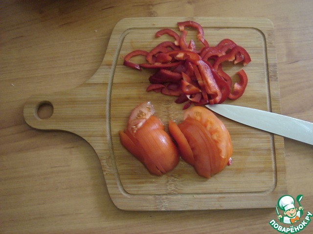 Далее -перцы: чили и болгарский, помидор. У чили я убрала зёрнышки. Вот здесь нужно овощи присолить, чтобы они дали сок. Я тушу овощи в собственном соке.