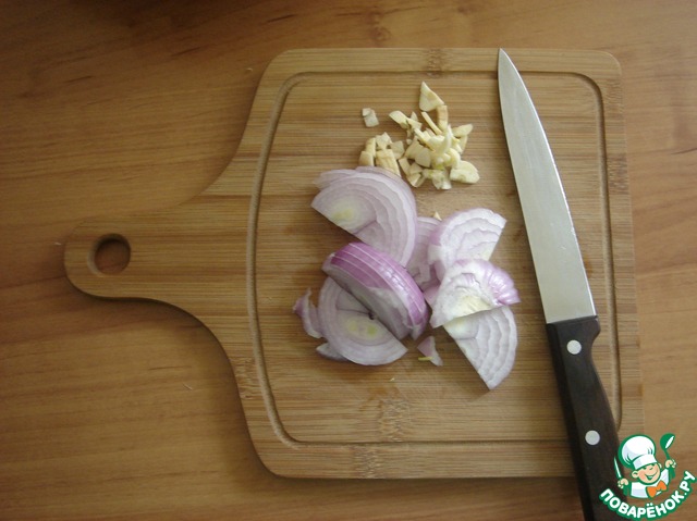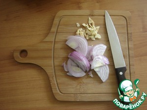 Ставим сковороду или сотейник на огонь, наливаем масло, разогреваем и выкладываем чеснок порубленный. Через минуту, когда масло станет ароматным, отправляем к нему лук.