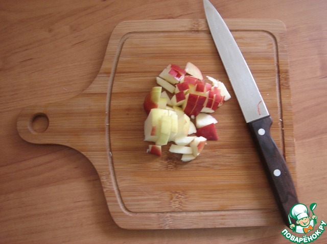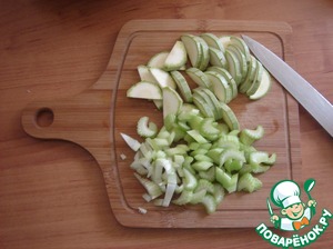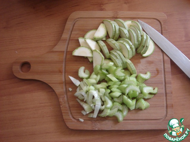 Далее следуют по порядку овощи. Овощи нарезаем произвольно, как нравится вам. Режем сельдерей и кабачок, отправляем в сковороду.
