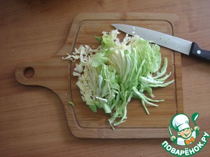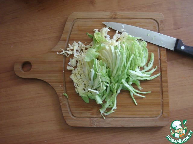 Режем тонко молодую капусту и тоже отправляем её в сковороду.