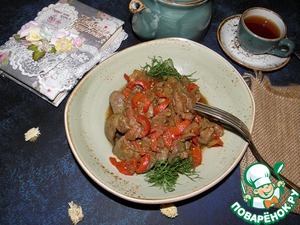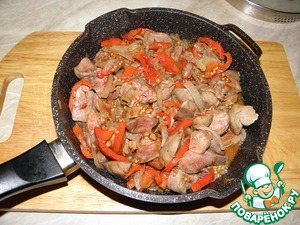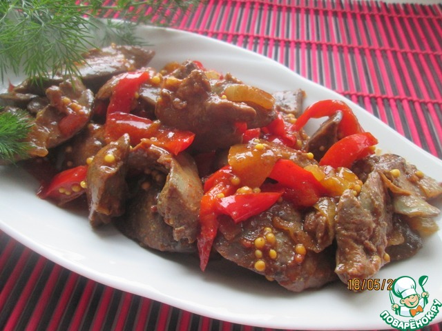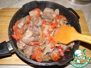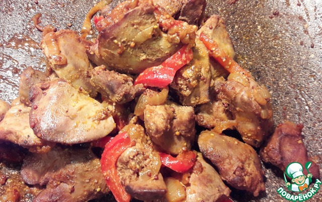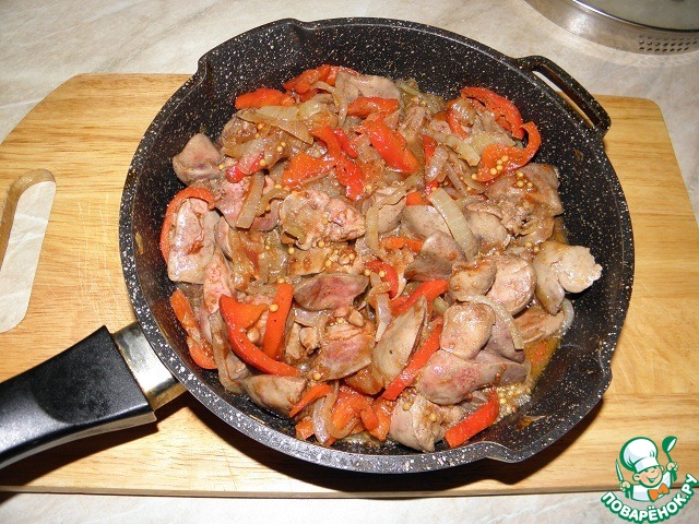 Печень промыть, очистить, нарезать, как вам нравится, только не очень большими кусочками, добавить в сковороду к луку и сладкому перцу
