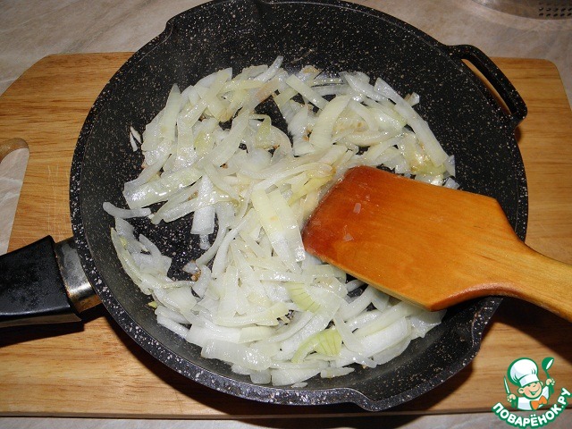 Лук нарезать полу- или четверть кольцами, обжарить на растительном масле.