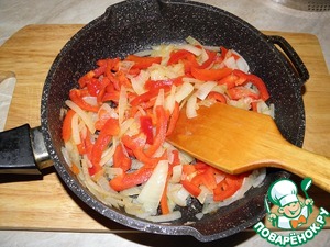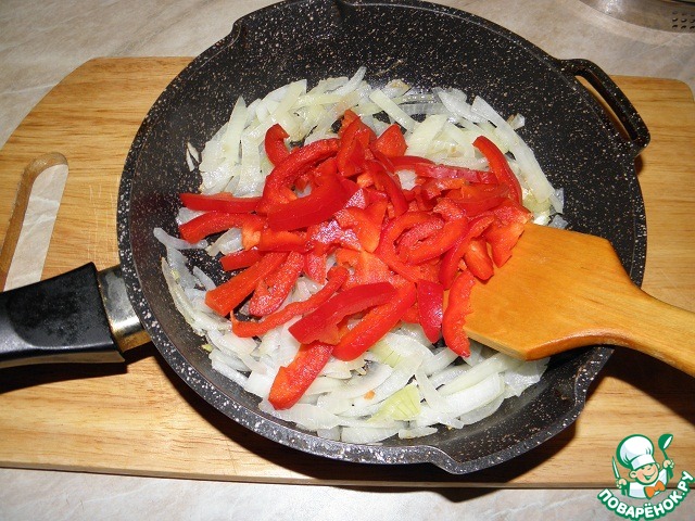 Перец нарезать соломкой. добавить к луку