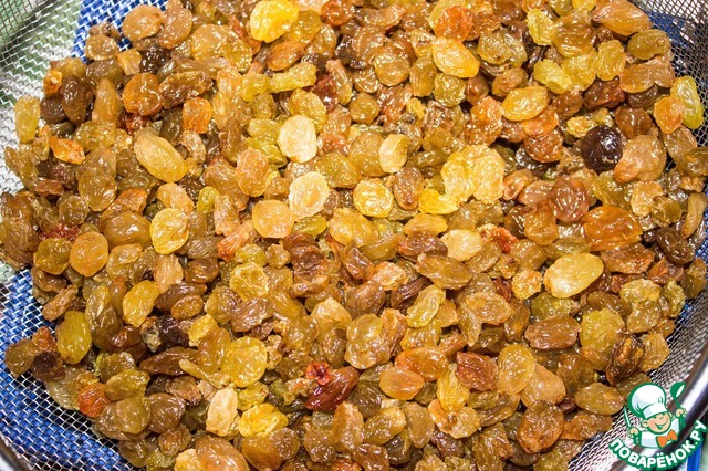 Изюм, если требуется, чистим от плодоножек, промываем. -
