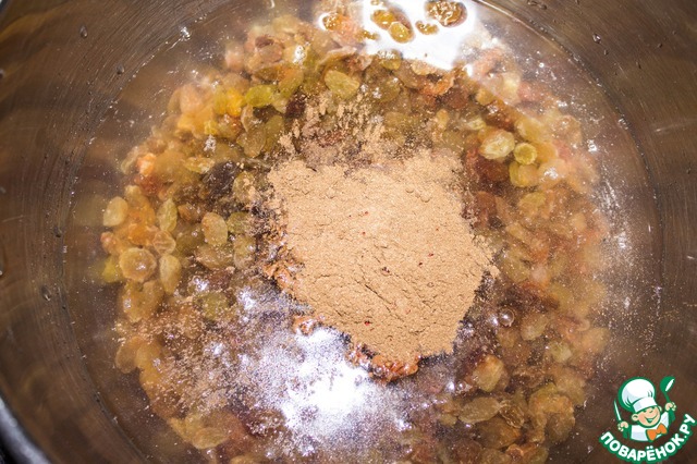 В кастрюлю наливаем воду, кладем изюм, добавляем патоку (я использовала свекольную), соль и пряности. Ставим на огонь.