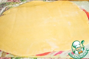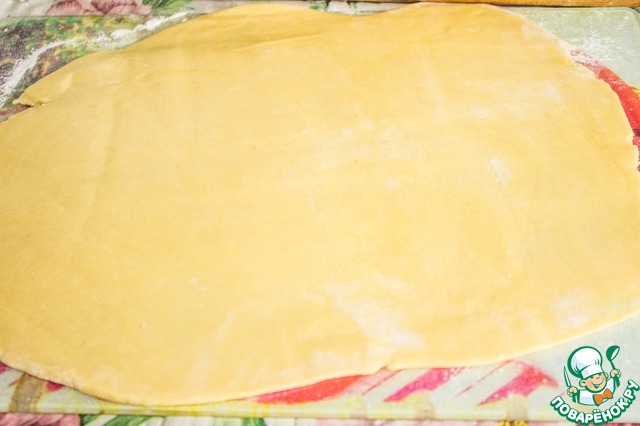 Достаем наше тесто, даем ему согреться минут 5. Затем пару раз обминаем и раскатываем каждую часть по размеру Вашей формы, учитывая бортики. (форма 25*16 см, бортики 7 см). Толщина теста должна быть 3 мм.