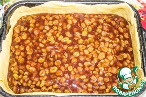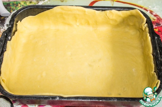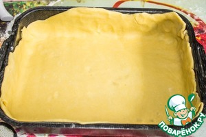 Форму смазываем маслом. Выкладываем первую часть раскатанного теста, хорошо разравниваем, приминая аккуратно к дну и бортикам.