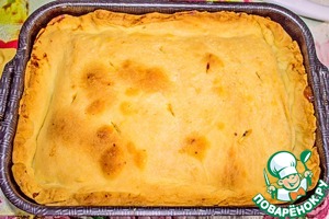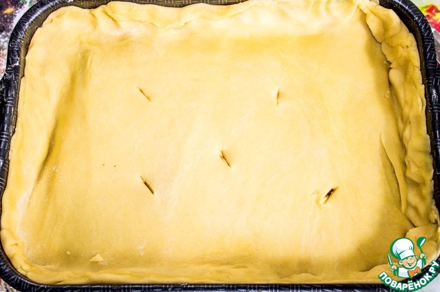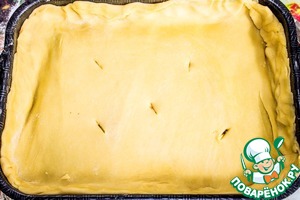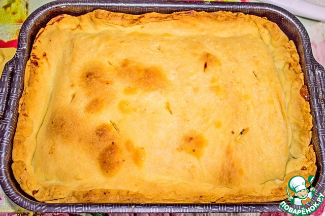 Закрываем начинку вторым слоем теста и защипываем края. Делаем на тесте проколы или надрезы, чтобы выходил пар. Духовку нагреваем до 200 градусов С и выпекает пирог 40 минут.