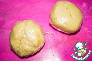 Тесто разделяем на две части (одну часть делаем побольше - для дна, вторую чуть меньше - верх пирога), заворачиваем в пищевую пленку и убираем в холодильник на 1-2 часа. Тесто так можно хранить до 2 дней, так что можно его готовить заранее с вечера.