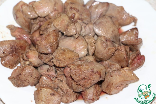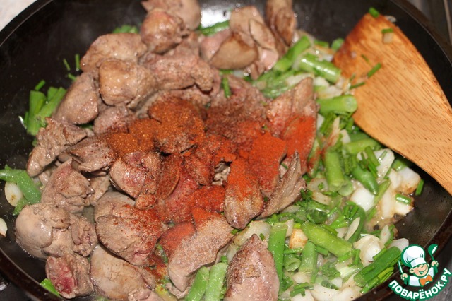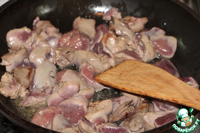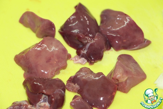 За время, пока варится рис, приготовим ароматное жаркое. Куриную печень порезать кусочками по 3 см
