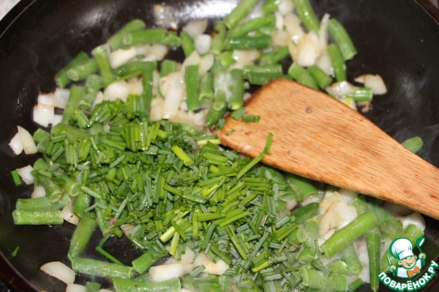 В эту же сковороду положить порезанный кубиками репчатый лук, готовить 1-2 минуты, затем кубики яблока (по желанию), мелкорубленный зеленый лук, стручковую фасоль (или морковь, или болгарский перец). Готовить еще 3 минуты.