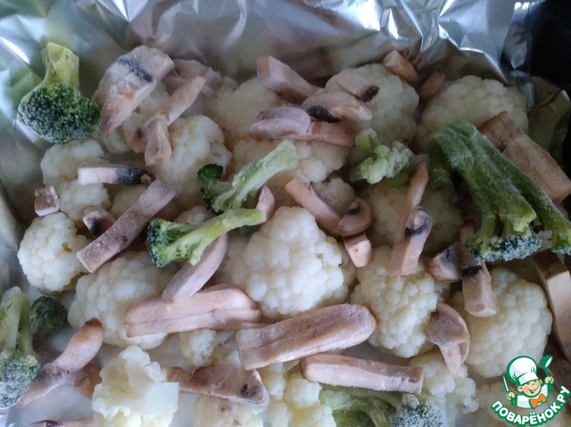 Разобрать обе капусты на соцветия и отварить в подсоленной воде до полуготовности. Высыпать на друшлаг и обдать холодной водой. Противень застелить пищевой фольгой и выложить цветную капусту и брокколи. Грибы (у меня мороженые) порезать и выложить поверх капусты.