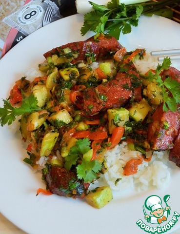 Выложить рис на блюдо, на рис - содержимое сковороды.