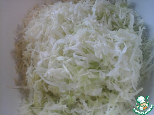 Капусту тонко нашинковать, посолить и хорошо помять руками. Затем отжать от сока.