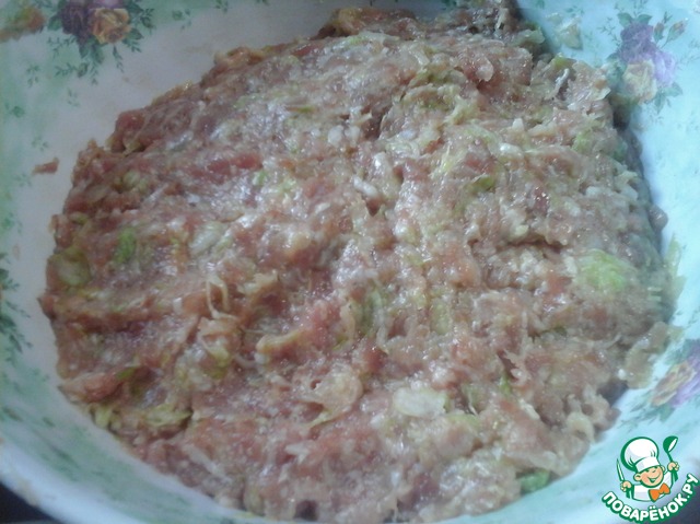 Смешать фарш с луком и капустой. Добавить соль, перец и приправу для курицы. Приправы можно брать любые на ваш вкус.