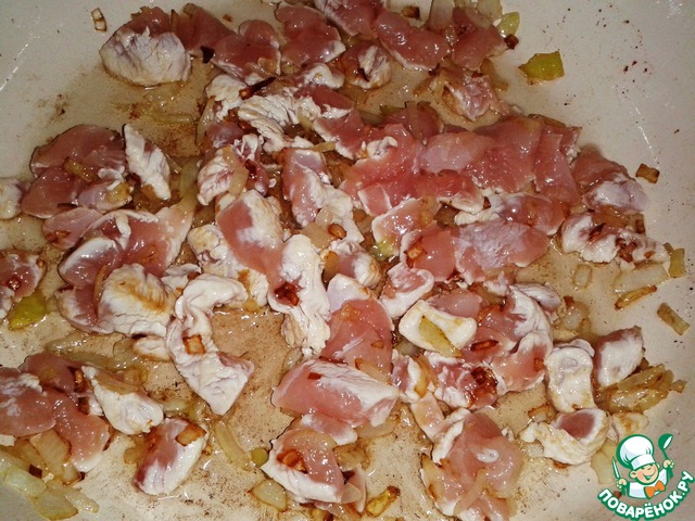 Как только лук набрал темно оранжевый цвет - выкладываем нарезанное филе индейки. Жарим минуты 2 помешивая, потом накрываем крышкой (тушим еще 4 минуты на большом огне, чтобы хорошо прожарилось).