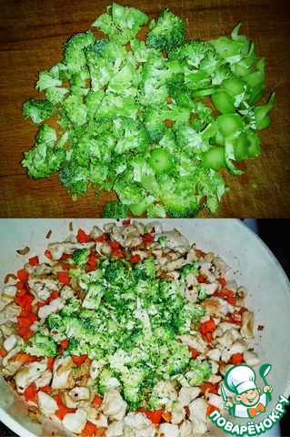 Дальше моем и нарезаем брокколи. Добавляем в сковородку.