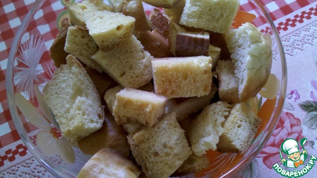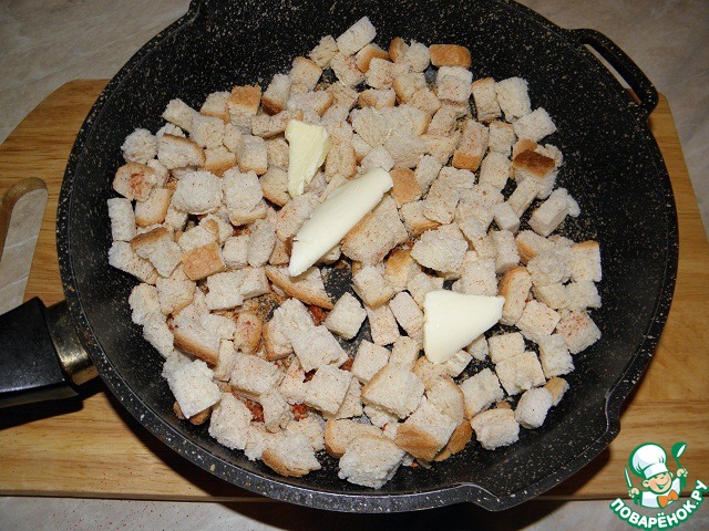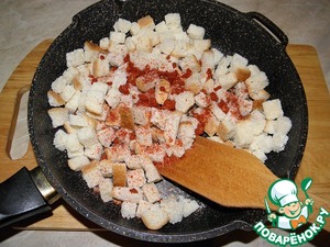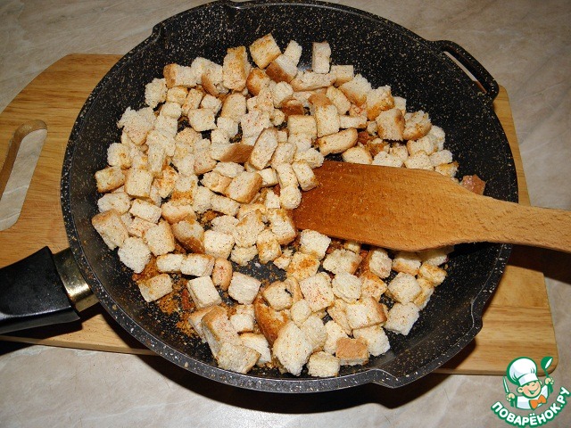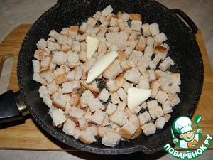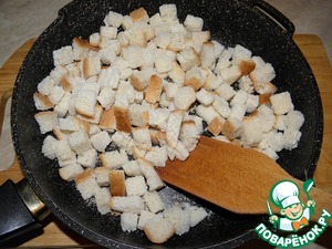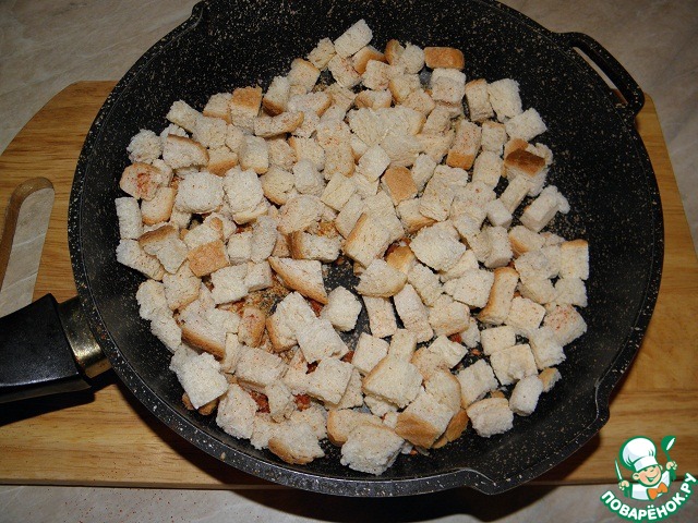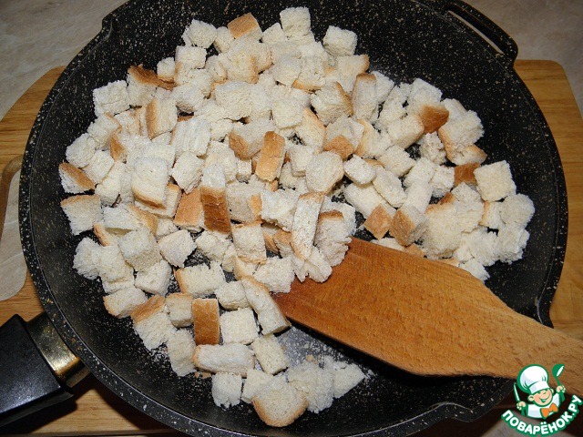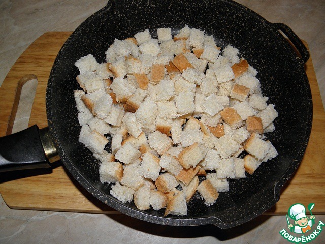 Сухую (лучше глубокую) сковороду прогреть, выложить нарезанный небольшими кубиками хлеб