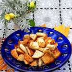 Много хлеба не бывает! Если вдруг он остается, то всегда нас выручает! Даже думать не придется, мы сухариков нажарим, вкус такой у них пикантный! И по дому разойдется аромат невероятный! Дорогие, угощайтесь! Похрустим все вместе дружно! И побольше, не стесняйтесь! Нам такое блюдо нужно!