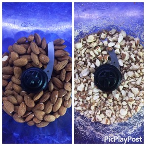 У автора рецепта были использованы миндальные хлопья. Я же заменила их на целый миндаль. Просто измельчила его в блендере, не до состояния муки, а таких вот кусочков как на фото.