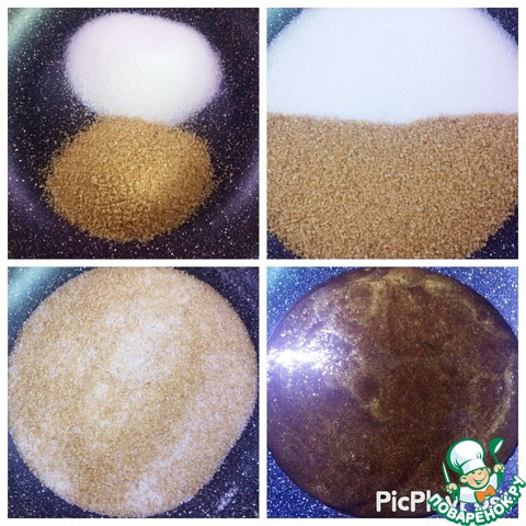 Готовим пралине. Сахар двух видов отправляем на сковородку, периодически ее встряхивая, растапливаем сахар пока карамель не приобретет коричневый цвет.