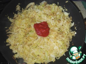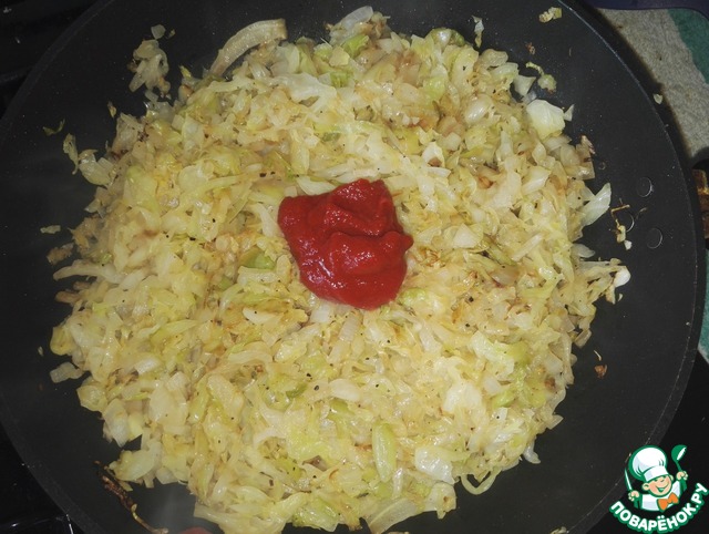Как только капуста приобрела коричневатый оттенок добавляем т. пасту и буквально пару ложек водички. Солим, перчим. Перемешиваем. Оставляем тушиться на медленном огне, периодически помешивая.