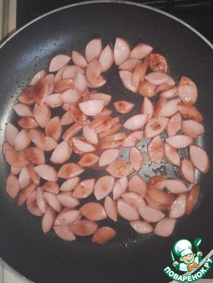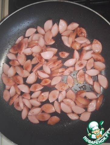 Пока готовится капуста, подготовим сосиски. Я беру подкопченые, они ароматнее. Режу сосиску, пополам, потом половинки на дольки, получаются полукружки. Поджариваю их отдельно на сковороде