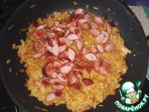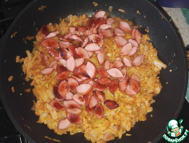 Смешиваем обжаренные сосиски с капустой, перешиваем и дает еще минут 5 потушиться.