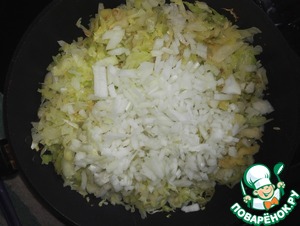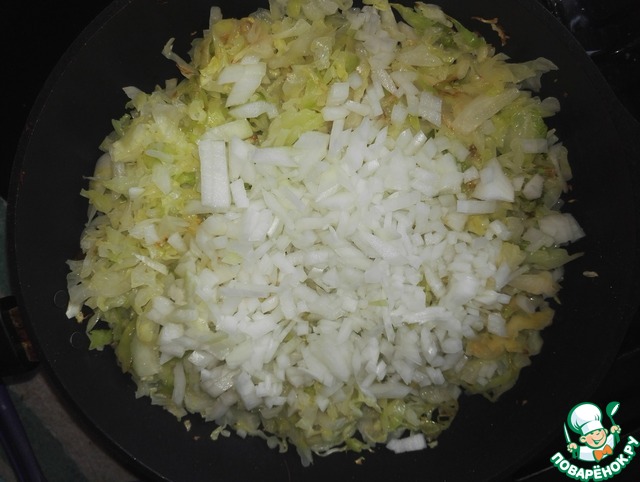 Лук режем кубиком и отправляем к капусте, продолжаем обжаривать