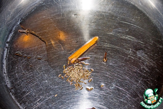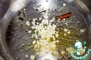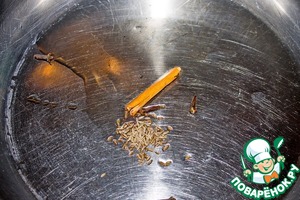 На сковороду наливаем растительное масло, выкладываем в масло лаврушку, гвоздику, зиру, палочку корицы обжариваем минуты 3.