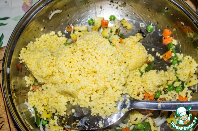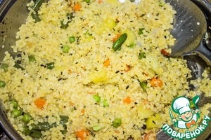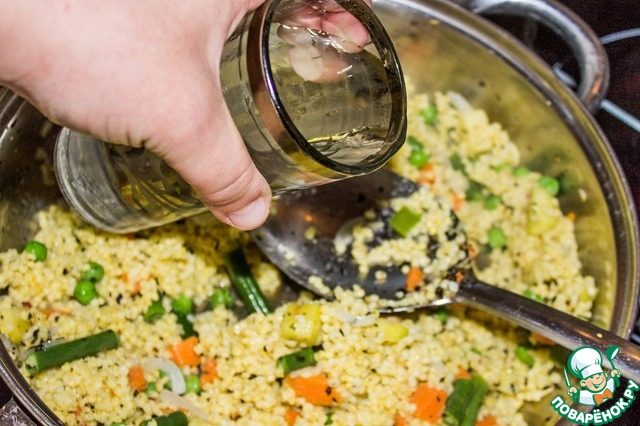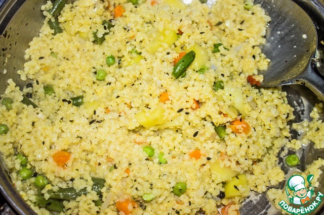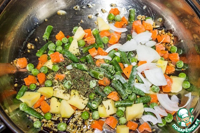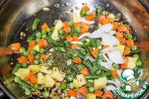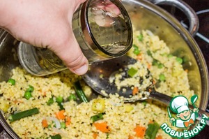 Достаем наше почти готовое пшено, выкладываем его из пакетиков к овощам со специями. Прогреваем с минуту.