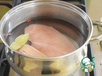 Отварить в хорошо соленой воде с добавлением перца-горошка и лаврового листа куриное филе до готовности. Вынуть мясо из бульона и остудить. |
