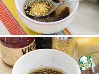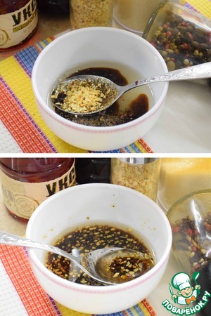 Приготовить заправку: в небольшую миску добавить растительное масло, уксус, соевый соус, сахар, перец, чеснок, пропущенный через пресс (или чесночный порошок) и хорошо перемешать. |