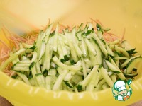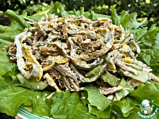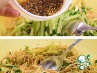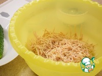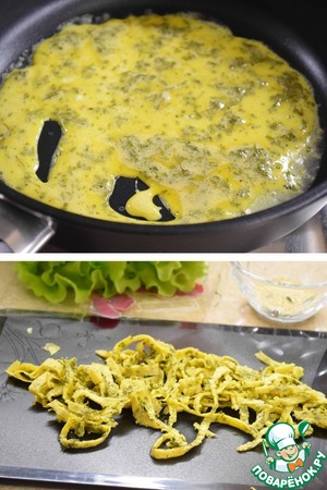 На раскаленной сковороде испечь "блин", остудить и порезать тонкой лапшой. |
