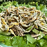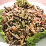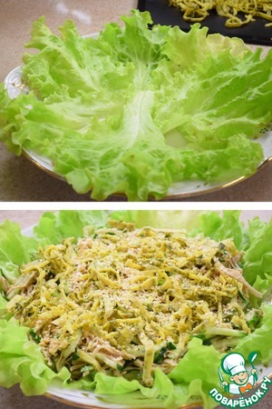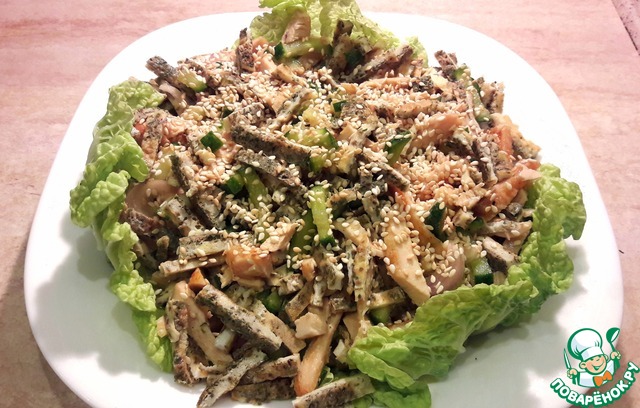 На блюдо выкладываем листья салата, "подружившийся" салат из холодильника, сверху порезанный лапшой блин и посыпаем все кунжутом. |