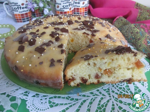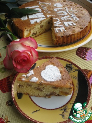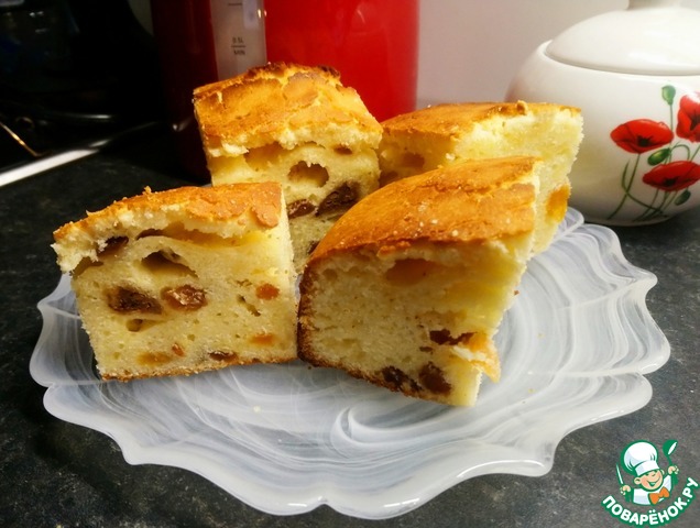 Курагу и изюм слегка обвалять в муке, чтобы они не опустились на дно пирога.