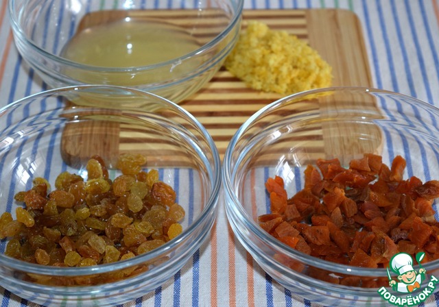 Изюм и курагу тщательно промыть, обсушить. Курагу нарезать небольшими кусочками. При необходимости (если сухофрукты твердые) заранее замочить курагу и изюм в теплой воде на час.