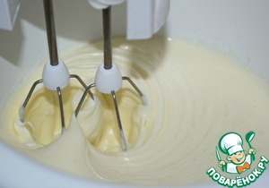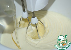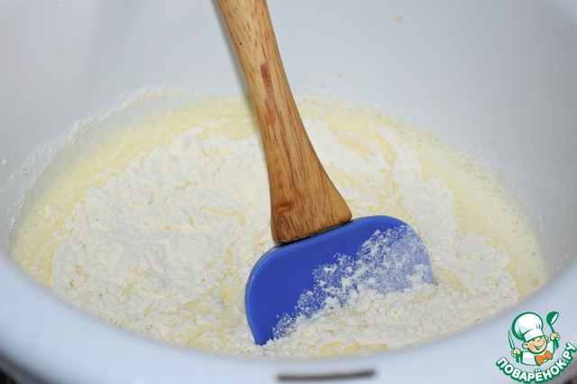 Просеянную с разрыхлителем муку в несколько приемов ввести в яично-масляную смесь, перемешивая лопаткой движениями снизу вверх.