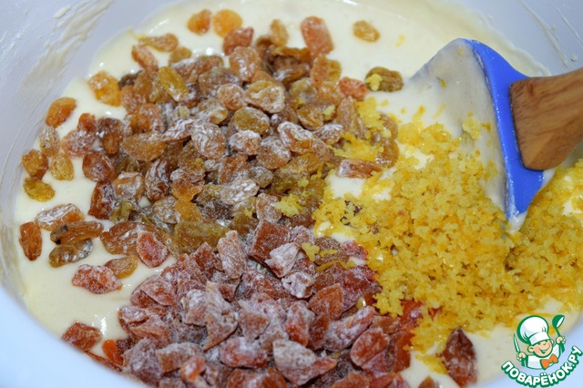 Вмешать лопаткой сухофрукты и цедру лимона в тесто. -