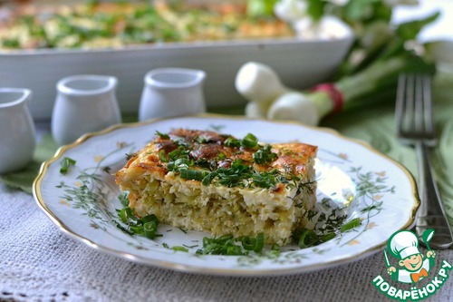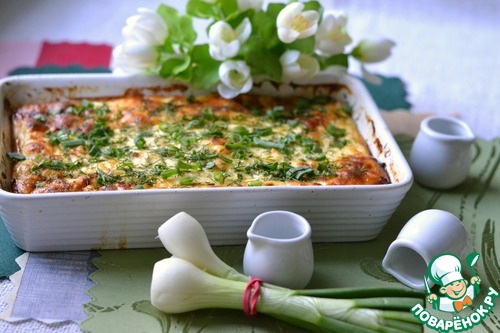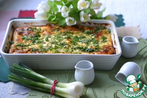 Еще горячую запеканку посыпать свежим укропом и зеленым луком.