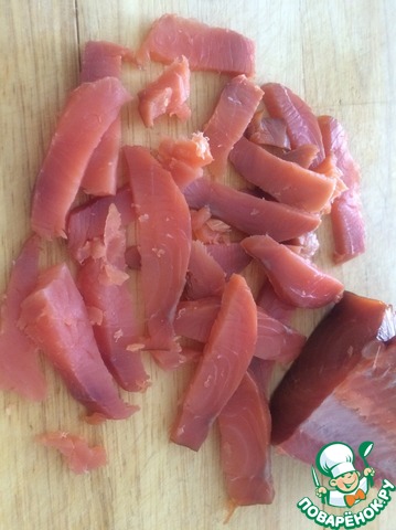- Рыба (У меня копчёная горбуша. Но может быть абсолютно любая рыба: свежая, малосольная, копчёная. Какая "скучает" в холодильнике. Только не пересоленную, иначе испортите блюдо, а себе настроение!) — 150 г