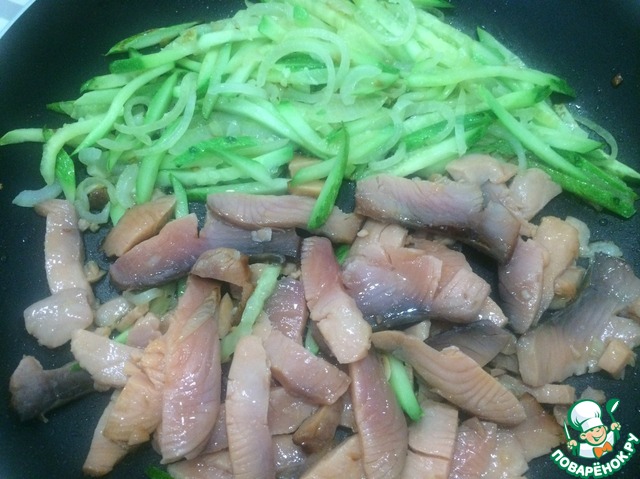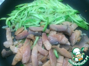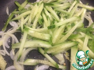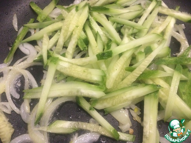 Добавить огурцы, обжарить помешивая буквально 30 секунд.