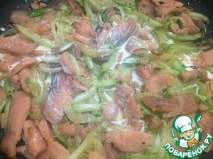 Сдвинуть на одну сторону огурцы с луком и чесноком, а на другой быстро обжарить рыбу.