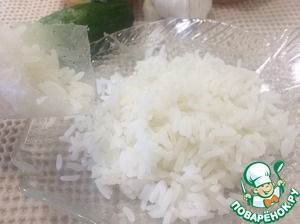 Отварить рис. Для этого блюда я отвариваю пропаренный рис "Янтарь" от фирмы "Мистраль". Он рассыпчатый, белоснежный и нежный.